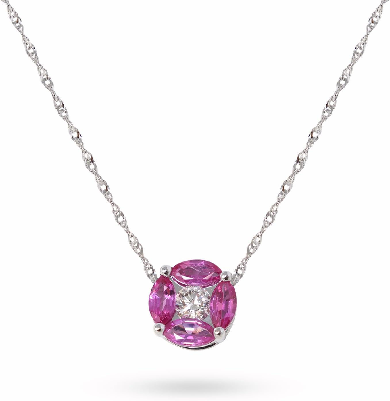 14K White Gold Pink Sapphire Natural Diamond Round Pendant Necklace