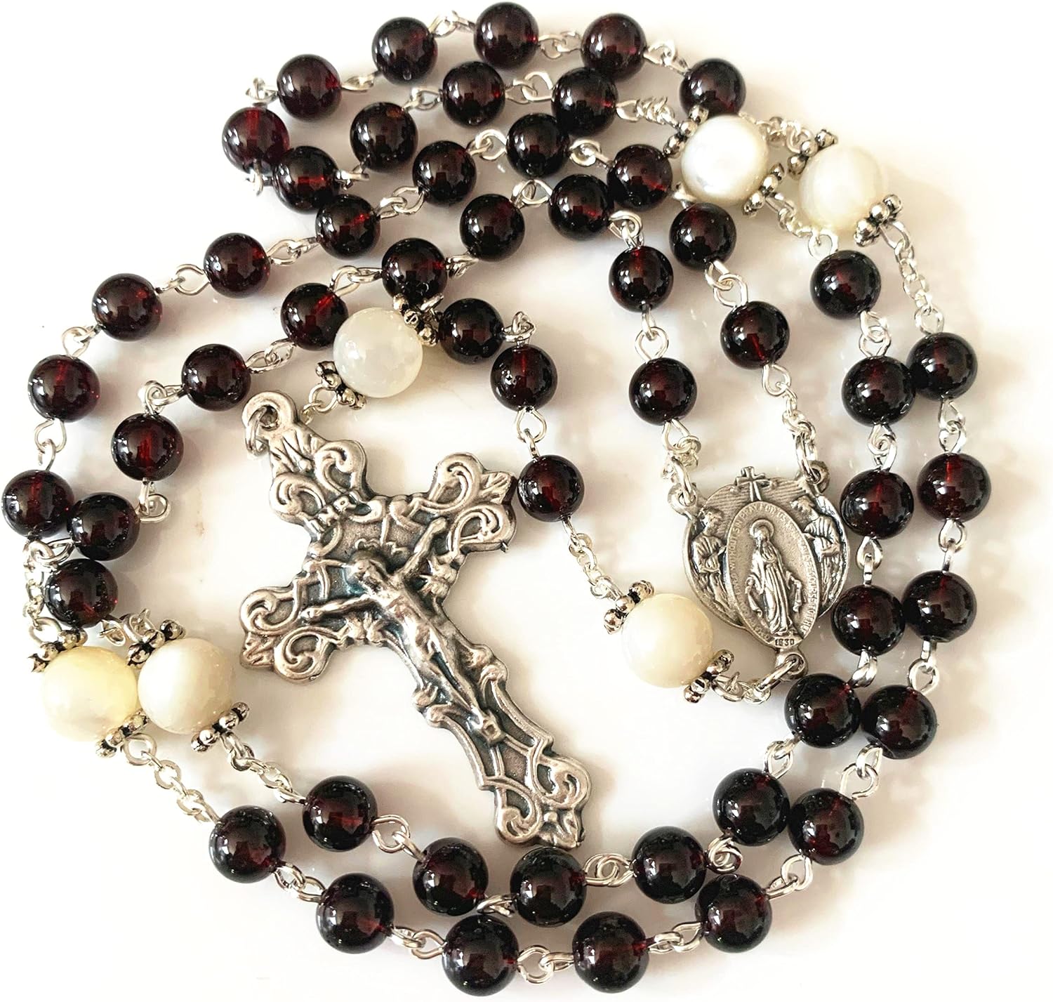 elegantmedical handmade Garnet Gemstone Beads Our Lady of GRACE 5 DECADE ROSARY Cross necklace