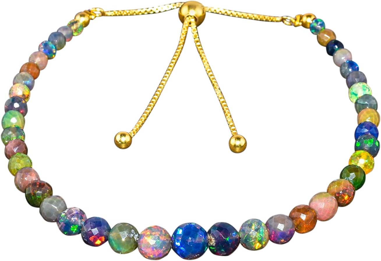 Natural Ethiopian Black Opal Gemstone Bolo Bracelet, Opal Crystal Beads, 14k Gold Plated Jewelry, 925 Sterling Silver, Adjustable Slider Chain, Birthday, Anniversary, Women Gifts, Mother's Day