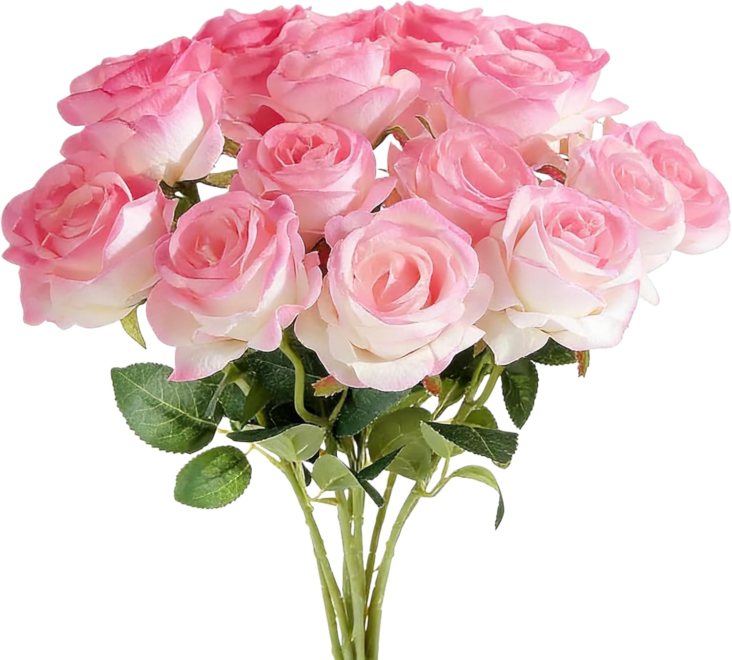 White-Pink Roses Artificial Flowers 15 PCS, Fake Roses Silk Flowers with Long Stems, Faux Rose for Wedding Centerpieces, Home Decor, Party Decor, DIY Bouquet (White-Pink)