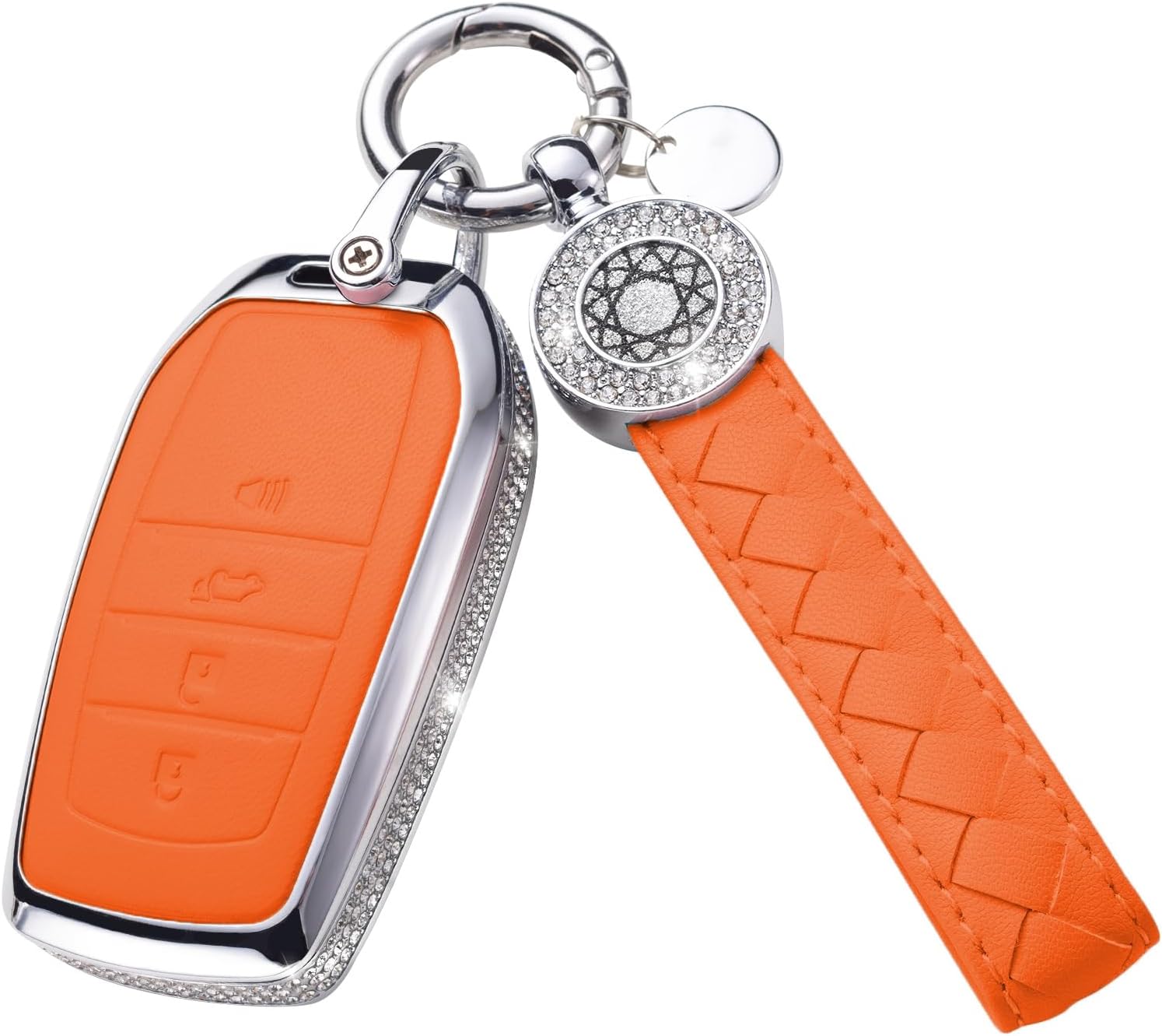 for Toyota Key Fob Cover with Keychain, Orange Leather Rhinestone Key Case Protection Shell Compatible with Avalon Camry Corolla RAV4 Sequoia Highlander Bling Car Accessories