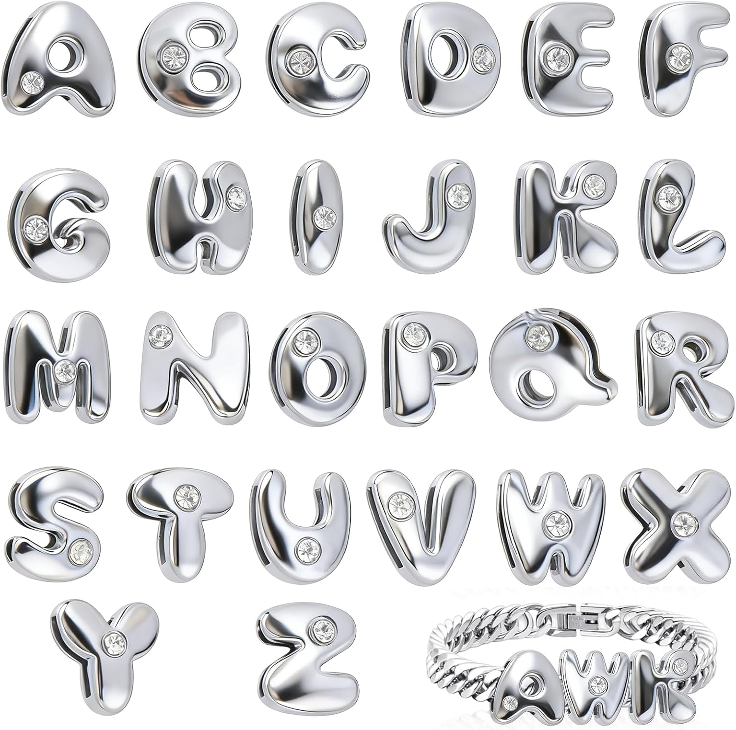 Silver Bubble Letter Charms, 52 Pcs A-Z Alphabet Jewelry Making Set Rhinestones Embellished Slide Beads for Wristbands Bracelets Necklaces Key Chains Earrings Craft Supplies Gift
