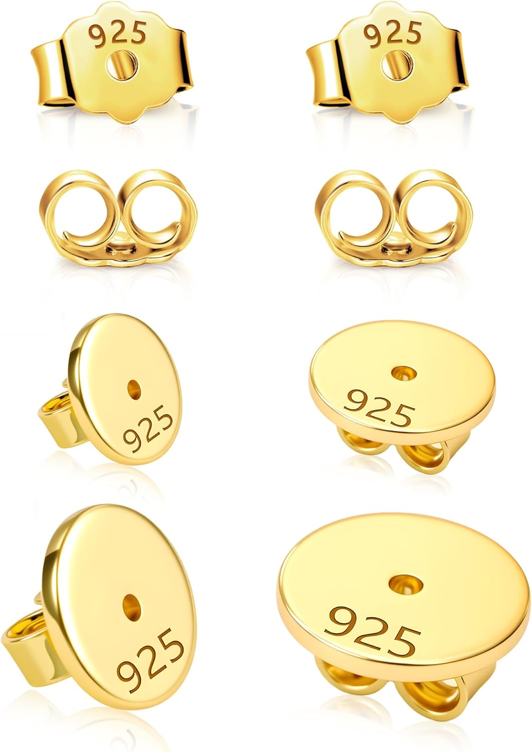 4Pairs 925 Sterling Silver Earrings Backs Replacements for Studs, Hypoallergenic 14K Goldplated Earring Backings for Posts Safety Locking Butterfly Ear Backs 5mm Large Flat Earrings Stoppers 6/8mm