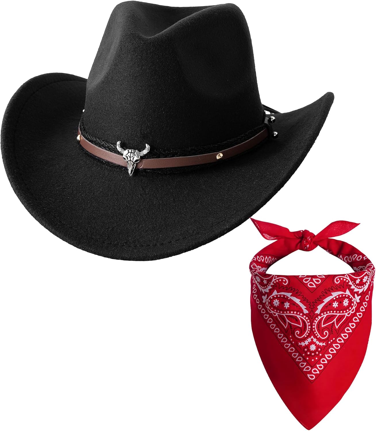 Jastore Kids Western Hats Boys Girls Cowboy Leather Buckle Felt Cowgirl Hat with Cowboy Red Bandanas