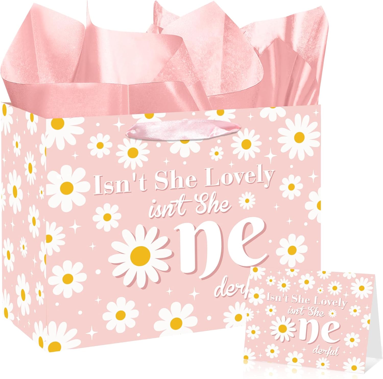 - 🌸Daisy 1st Birthday Gift Bag: You will get daisy flower decorations includes 1pcs daisy flower gift bag, 1pcs daisy flower greeting card, and 3pcs pink tissue paper. The pink groovy daisy flower decorations card can be written on the front or back with a blessings for a child's future, or your special wishes to give as a gift