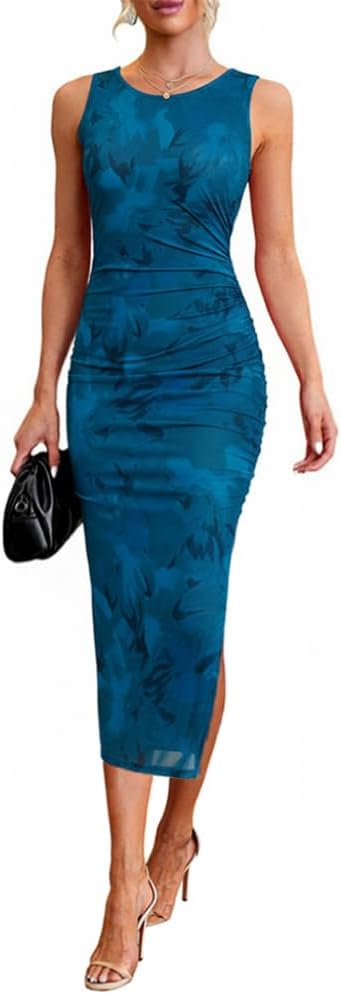 oten Women's Sleeveless Mesh Floral Summer 2025 Ruched Bodycon Slit Wedding Guest Cocktail Party Midi Dress