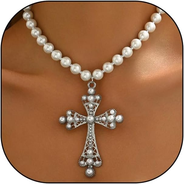 Pearl Cross Necklace for Women,Gothic Gold Chunky Long Big Cross Pendant Necklace,Pearl Beads Chain Large Crucifix Dangle Necklace for Punk Party