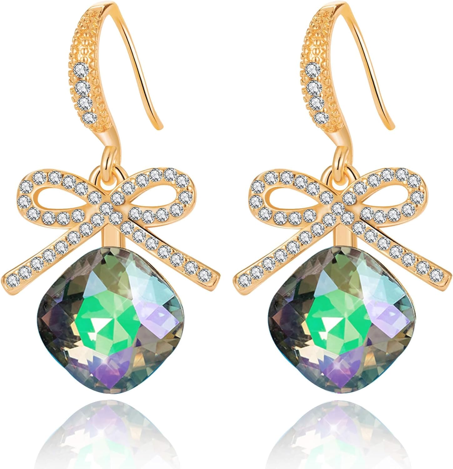 EVEVIC Austrian Crystal Cushion Bow Drop Earrings for Women 14K Gold Plated Hypoallergenic Dangle Earring Jewelry Gifts