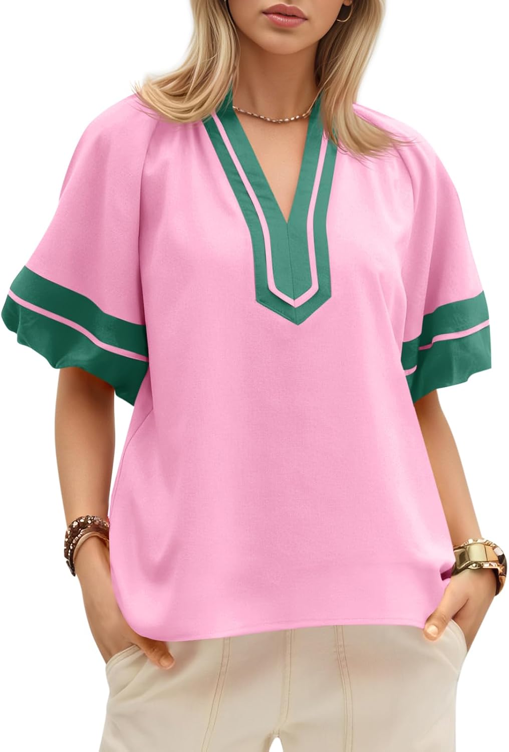 Tankaneo Womens Color Block Puff Sleeve Tops Dressy Casual V Neck Cotton Blouses Summer Loose Fit Tees Shirts