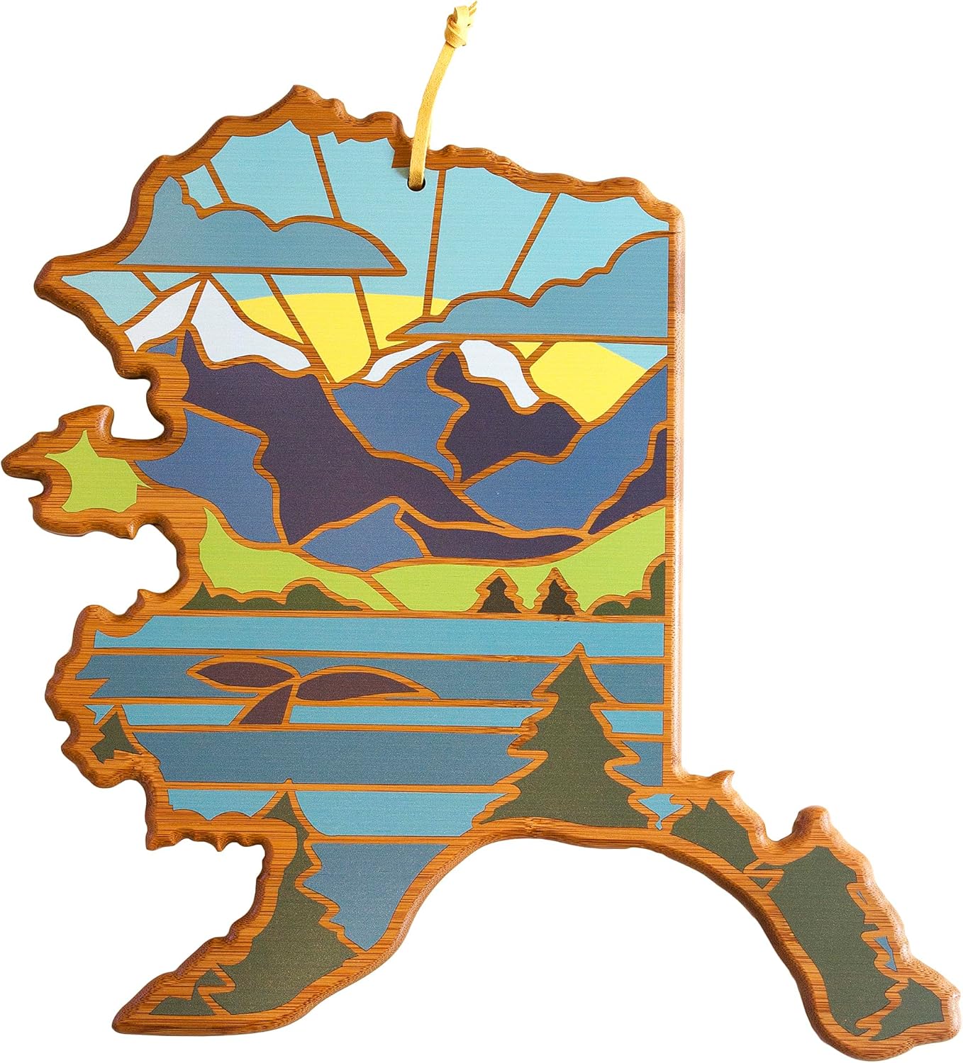 Totally Bamboo Alaska State Shaped Cutting Board and Charcuterie Serving Platter with Artwork by Summer Stokes, Includes Hang Tie for Wall Display