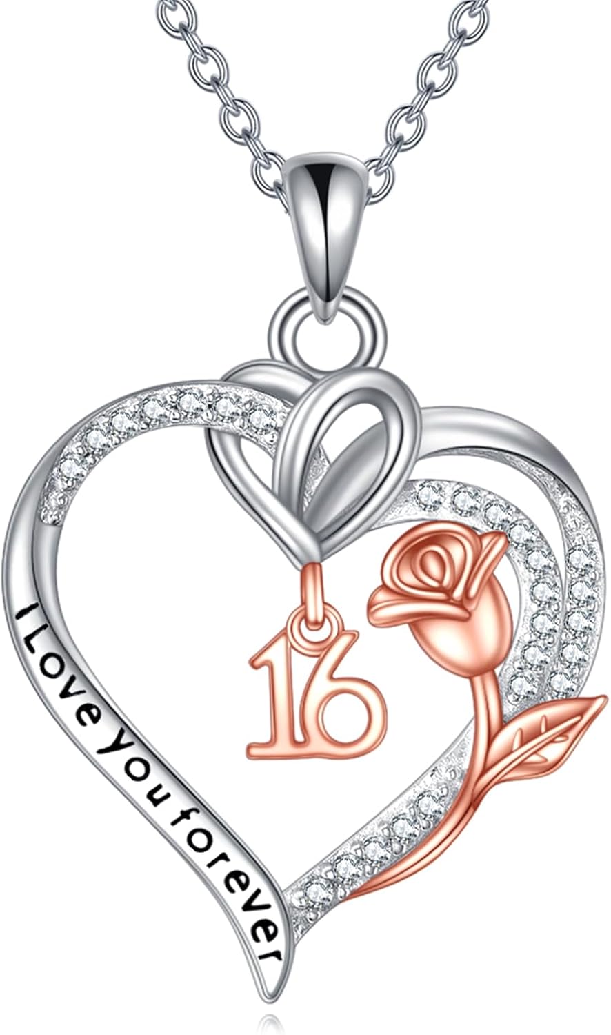 Birthday Necklace Sterling Silver 16th 18th 21th 80th Birthday Pendant Necklace Heart Rose Flower Birthday Jewelry for Women Mothers Day Christmas Gifts