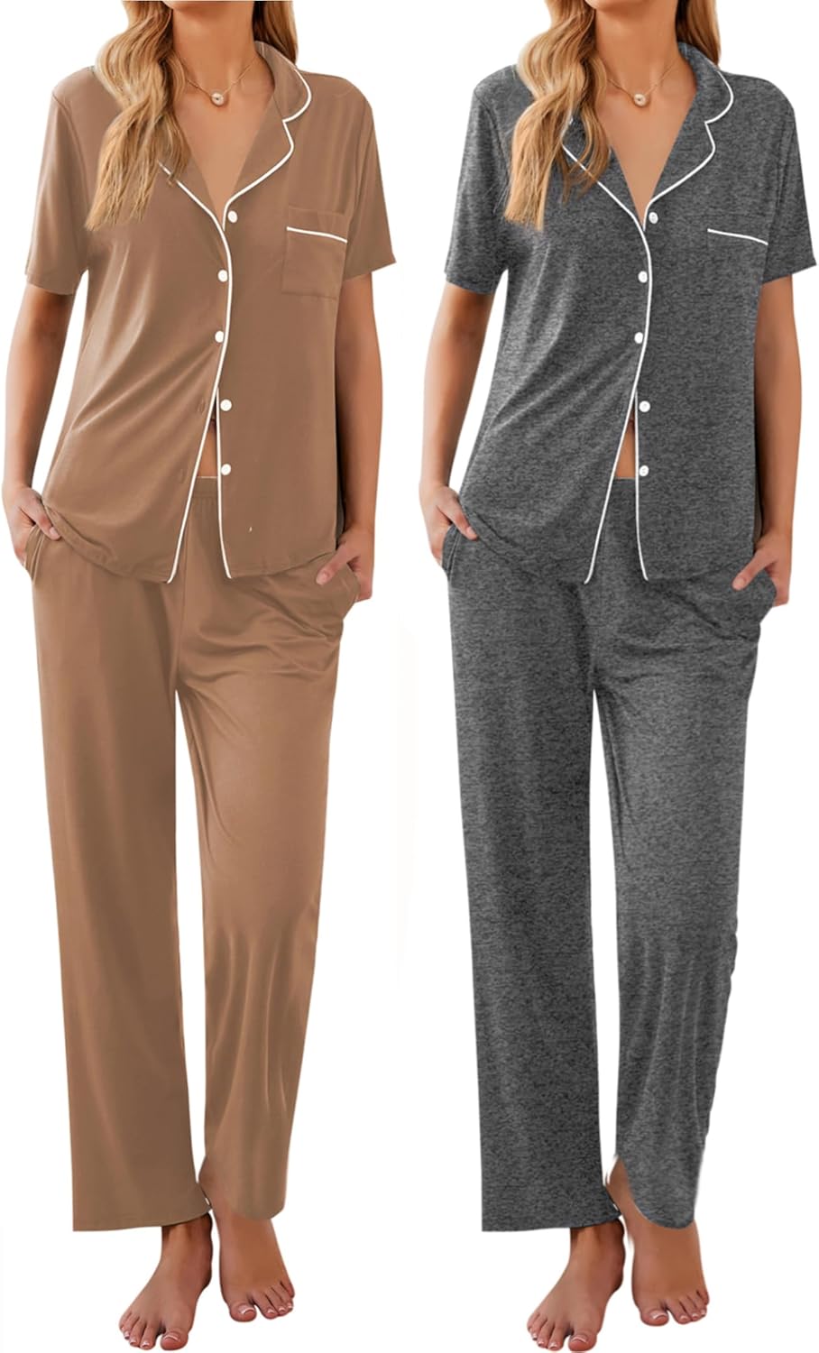 Ekouaer 2 Pack:Womens Pajamas Short Sleeve Pjs Notch Collar Button Up Loungewear Cozy Sleepwear Sets