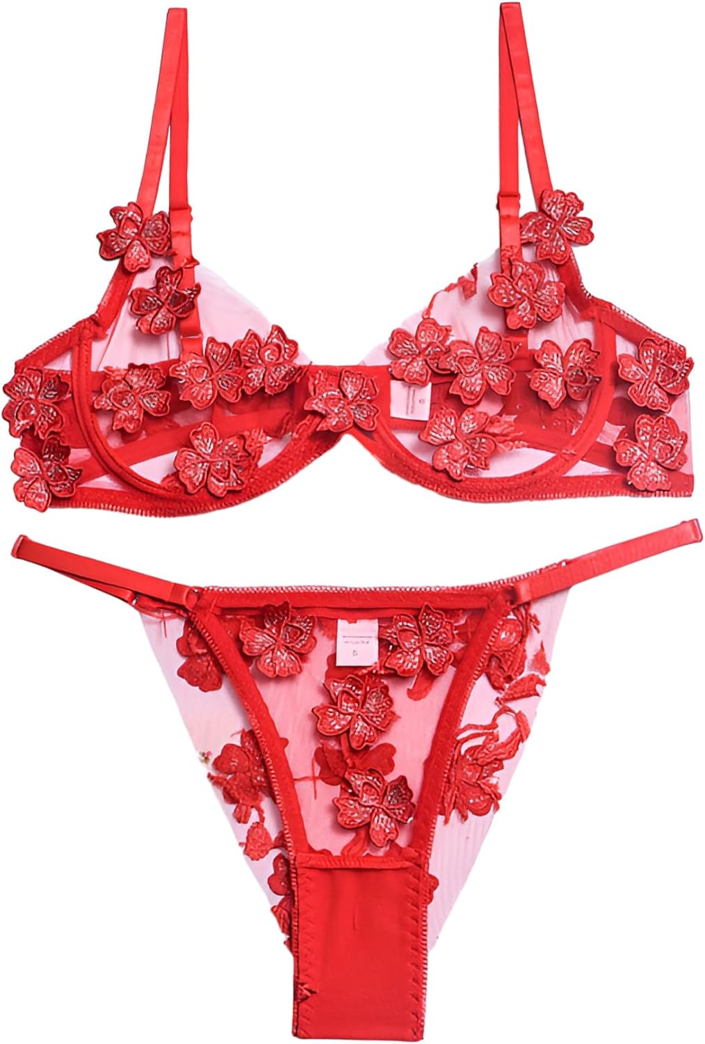 Lilosy Sexy Applique Floral Mesh Sheer Underwire Lingerie Set 2 Piece