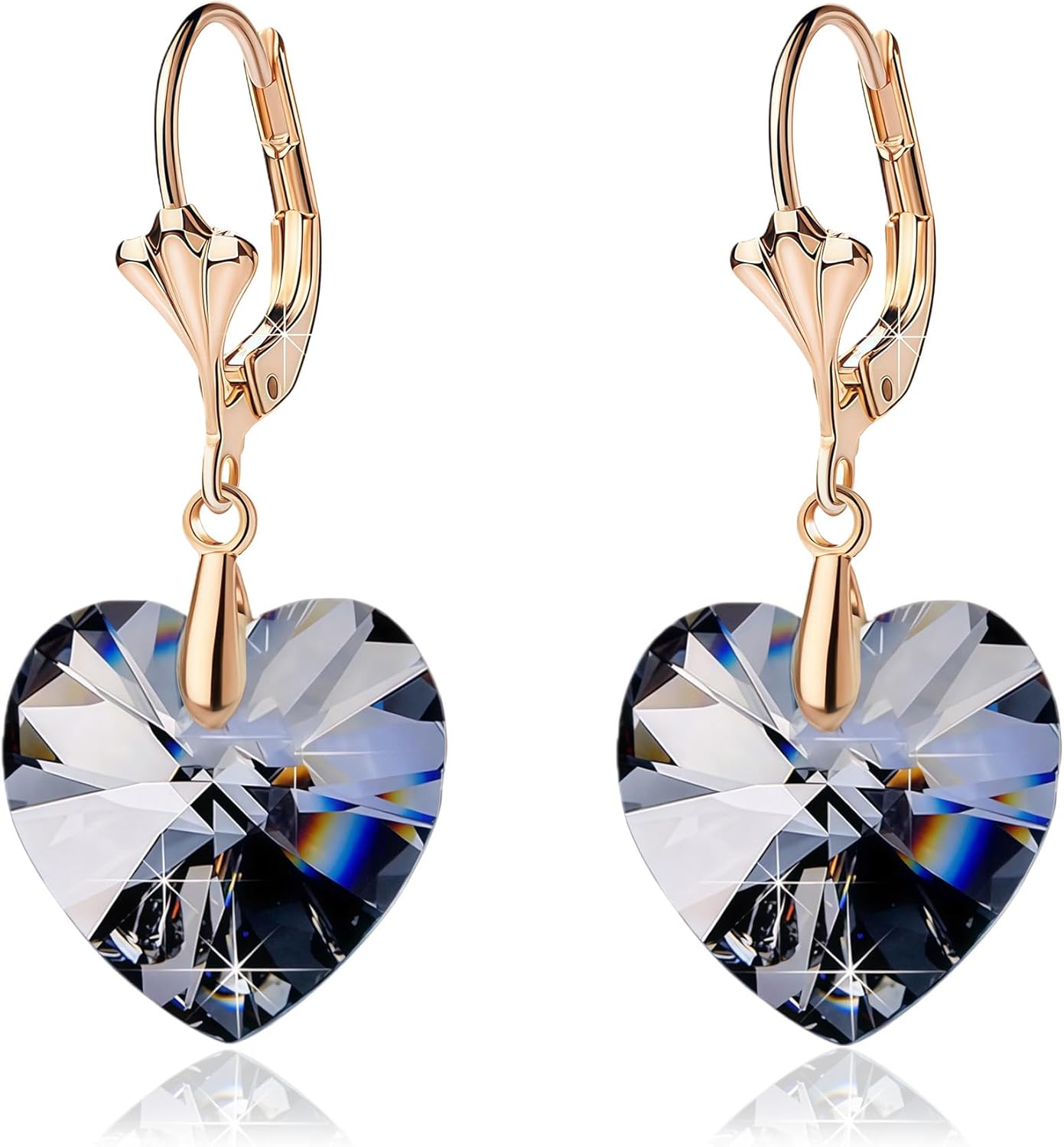 Austrian Crystal Heart Drop Leverback Earrings for Women Fashion Dangle Earring 14K Rose Gold Plated Hypoallergenic Jewelry