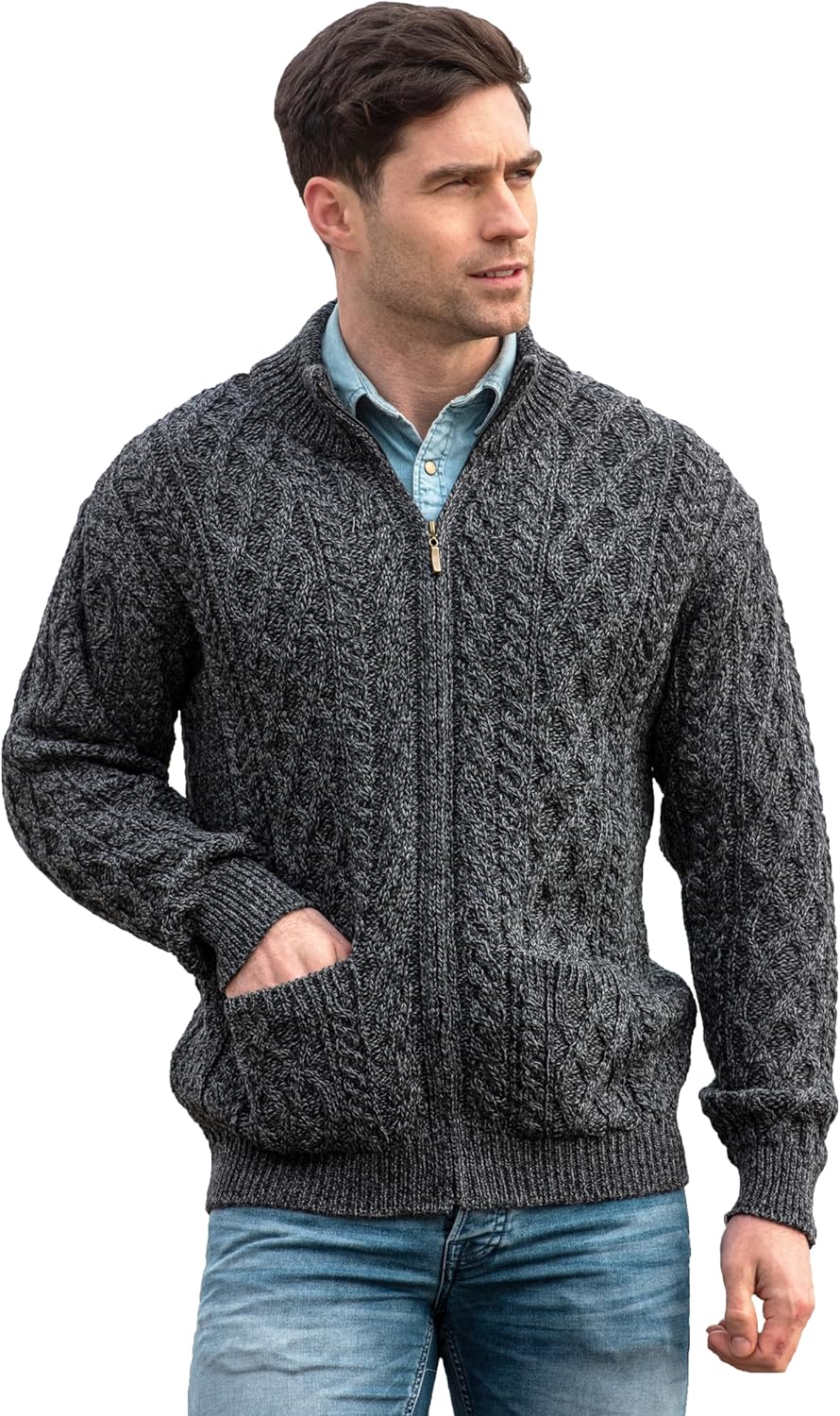 Aran Crafts Mens Zip Cardigan 100% Merino Wool, Made in Ireland