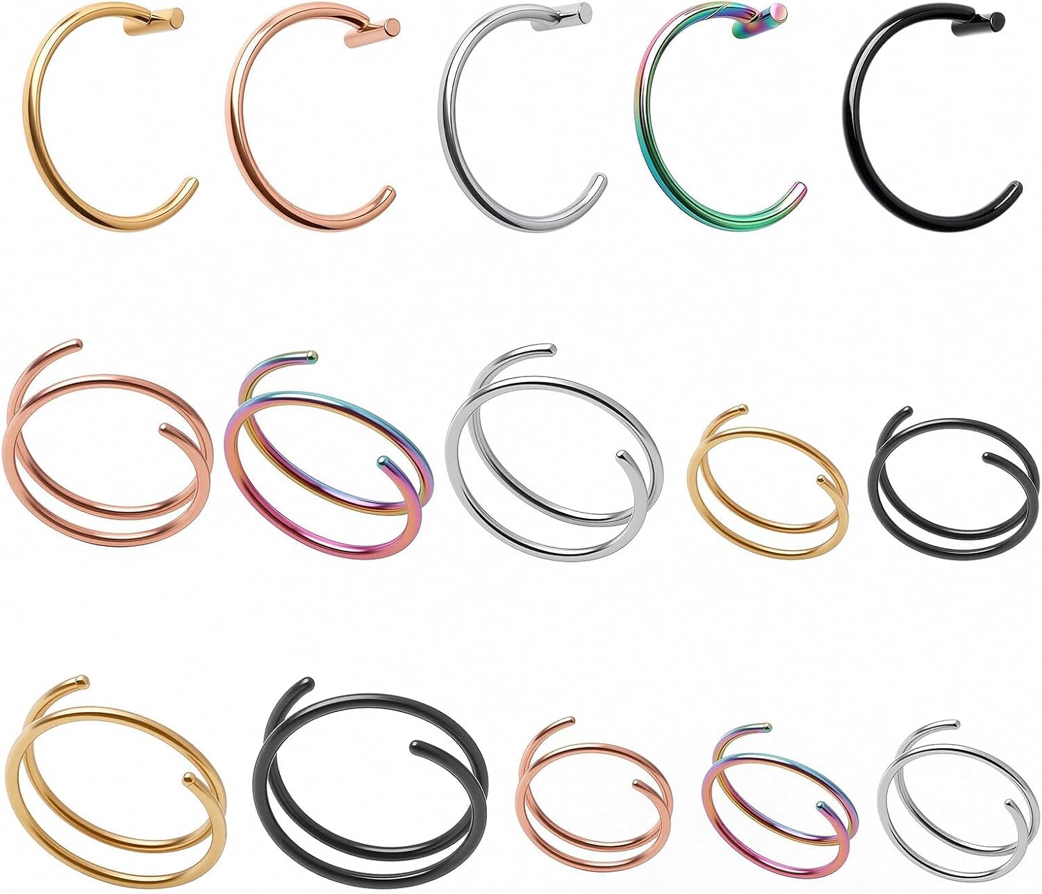 15PCS Clip On Septum Nose Ring, 2 Size Clip Nose Ring-8mm/ 10mm, Stainless Steel Gothic Clip on Non piercing, Nose Rings Hoops Double Hoop Nose Ring, Fake Piercing Jewelry Hoop for Faux Lip Septum Nose Ring