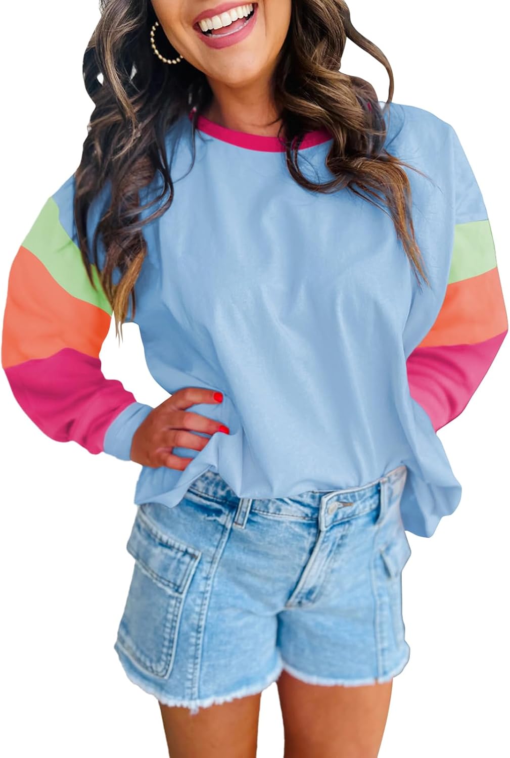 miduo Womens Long Sleeve Tops Color Block Stitching Casual Loose Fit Crew Neck Shirts Blouses