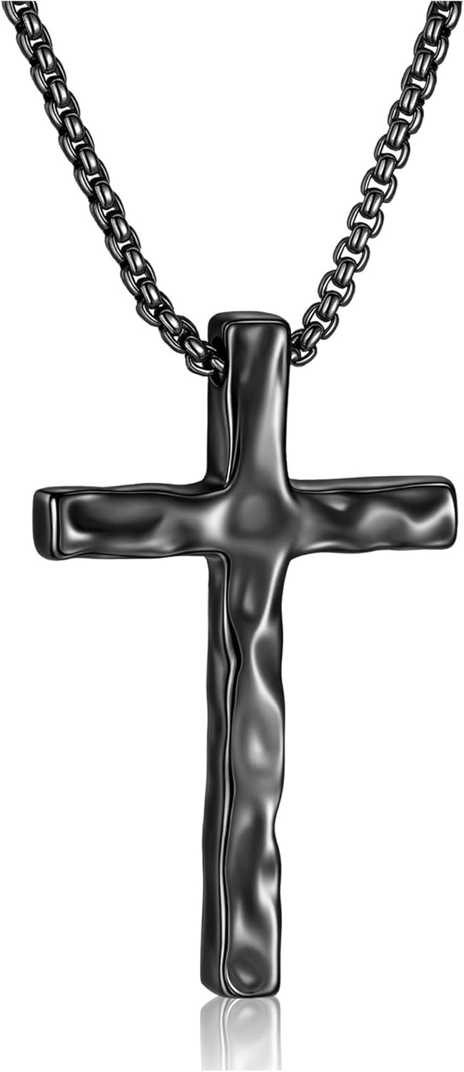 Easter Basket Stuffers- Cross Necklace for Men- Hammered Cross Pendant with Box Chain Vintage Unique Crucifix Necklaces for Men, Mens 18-24 Inches Chain Cross Necklace Christian Religious Christmas
