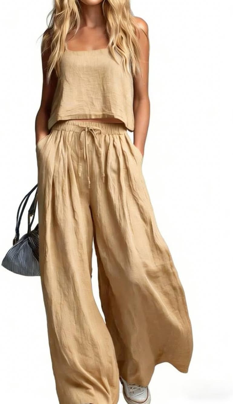 2 Piece Summer Women's Outfits Casual Vest Loose Wide Leg Pants Spaghetti Strap Tank Top and Pants Sets with Pockets