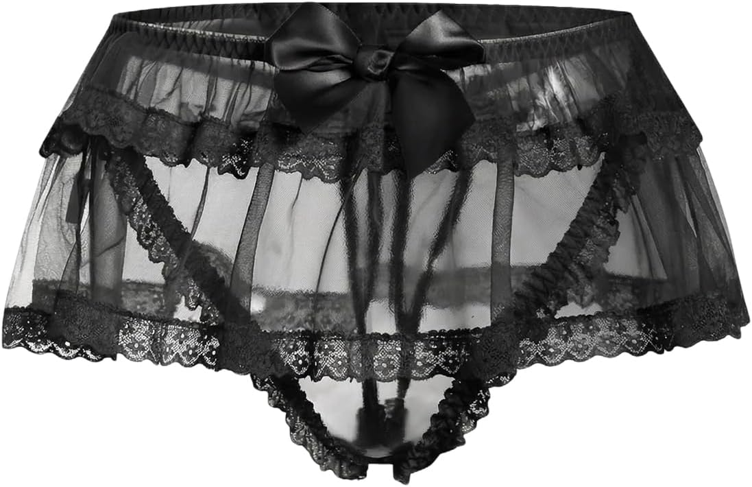 OYOANGLE Women's Sheer Mesh Thongs Cute Bow Ruffle Lace Trim Panties Lingerie Underwear
