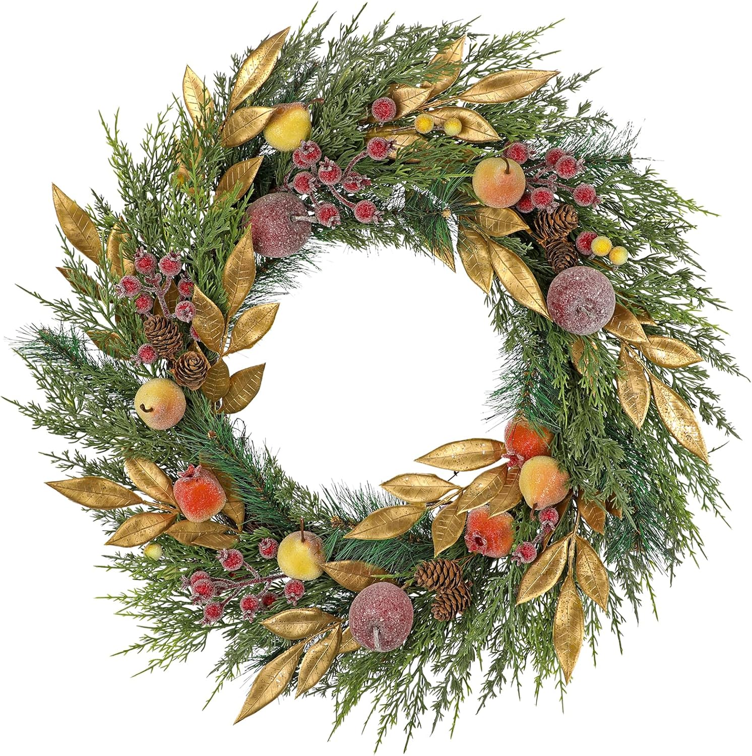 - Xmas Door Wreath with Rich & Layered Details. Tired of plain green wreaths that lack personality? This Christmas wreath indoor captures the joyful chaos of Christmas morning. Decorated with frosted red apples, golden eucalyptus, pinecones, berries, and pears, front door christmas wreath is a holiday door wreath bursting with life and color. Whether you prefer farmhouse Christmas wreaths or Christmas décor, Christmas outdoor wreath fits beautifully.