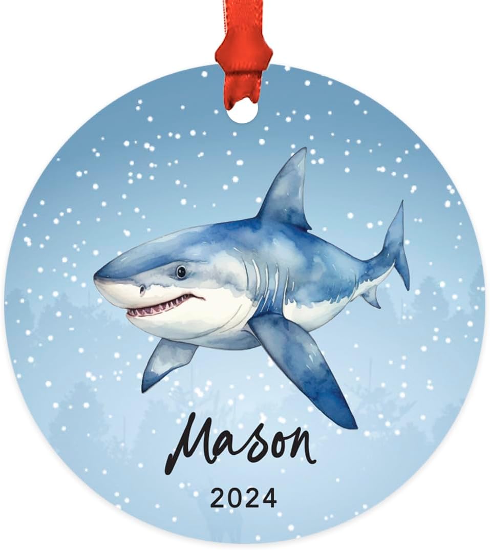 Andaz Press 3.5" Metal Personalized Shark Ornament 2026, Blue Shark Design, Custom Shark Ornaments for Christmas Tree, Customized Shark Christmas Ornament for Kids, Shark Lovers, Marine Life
