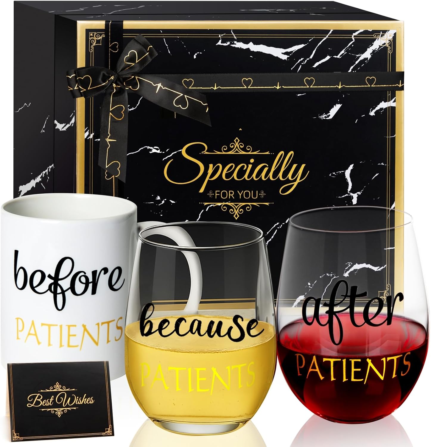 - GREAT GIFT IDEA: Before Patients coffee mug, After Patients stemless Because Patients wine glasses set is a great gift idea for nurse, doctor, dentist, physician or any other medical workers. A warming gift, every time they drink wine, or champagne, they will think of you