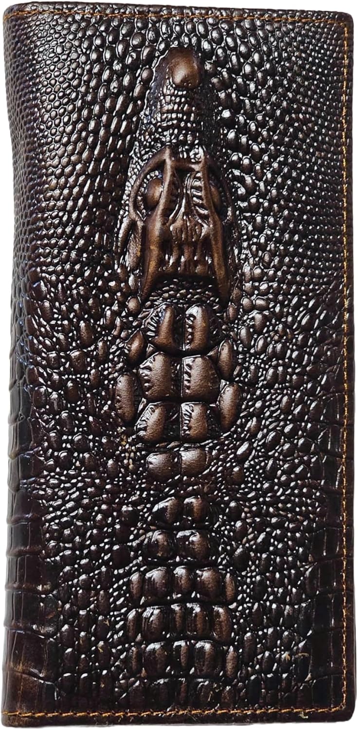 Genuine Leather Bifold Long Wallet for Men, Retro Vintage Embossed Clutch with Zipped Coin purse & Credit card Slots. RFID Blocking. Crocodile Head- Coffee