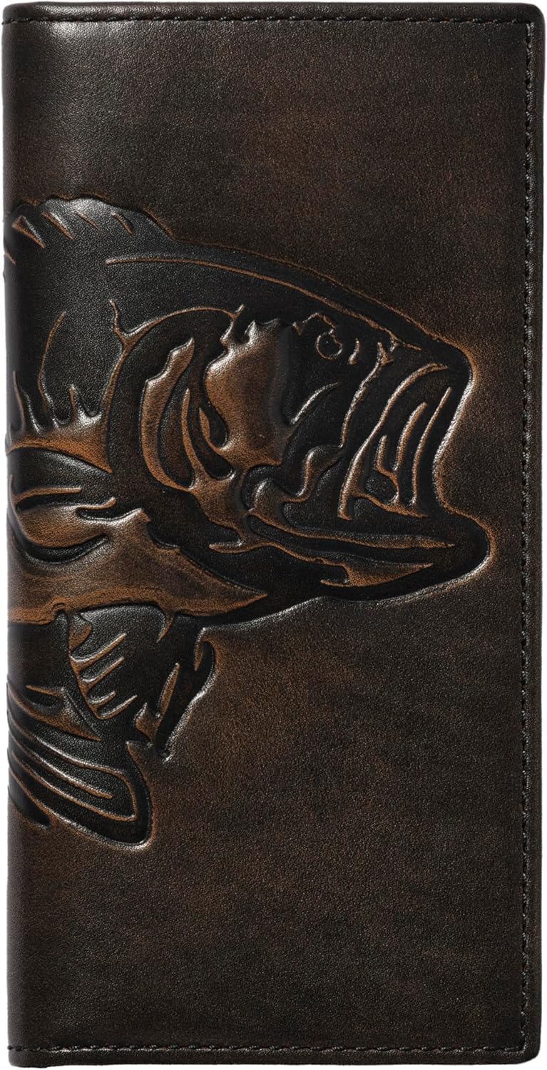 - GONE FISHIN’: Jack’s Bass Fish Long Bifold Wallet for men hooks rugged style and everyday function for anglers and outdoorsmen. Crafted from full-grain, hand-burnished leather, this fishing wallet features a bold embossed bass graphic and a hand-burnished finish that only gets better with time. Slim yet spacious, this rodeo wallet keeps cards and cash neatly organized while fitting comfortably in your back pocket. Inside, the “fish on” screen print gives a nod to those who live for the catch.