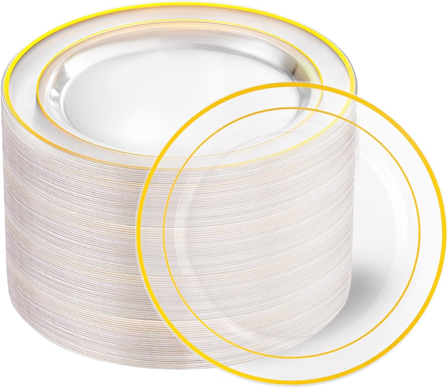 - PERFECT FOR ALL OCCASIONS: These clear and gold plastic plates are perfect for parties, holidays, weddings, birthdays, bridal showers, dinners, barbecues and more.Reusable, sturdy and healthy for everyday use. Also the disposable salad plates are a perfect gift choice for your beloved ones, friends, anyone wants to throw an event.