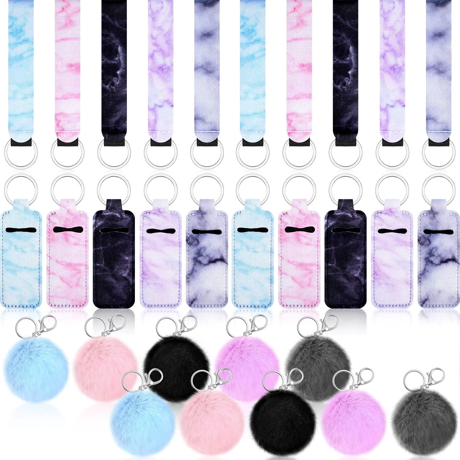 Hicarer 30 Pieces Marble Lipstick Holder Keychain Lip Balm Holder Set Lipstick Bags Set Includes Keychain Wristlet Lanyard, Marble Style Lip Balm Bag and Ball Pom Pom Accessory(Square)