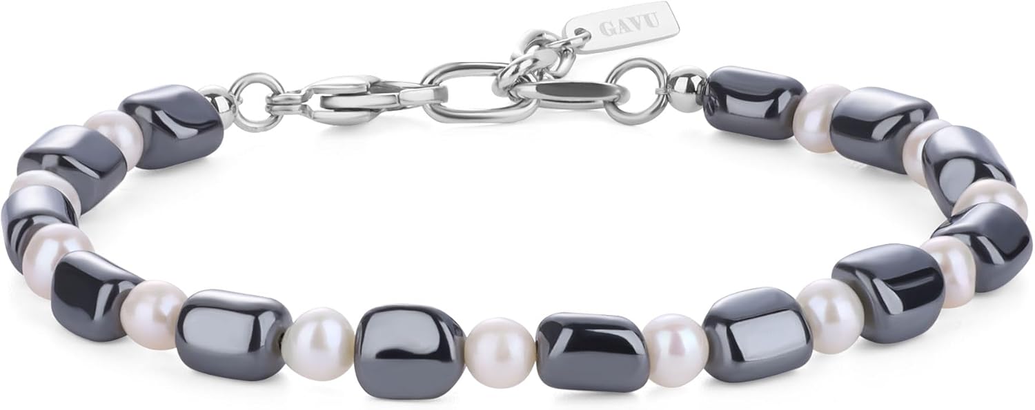 GAVU Stainless Steel Beaded Bracelet for Men, Men's Hematite Bracelet Pearl Bracelet for Men