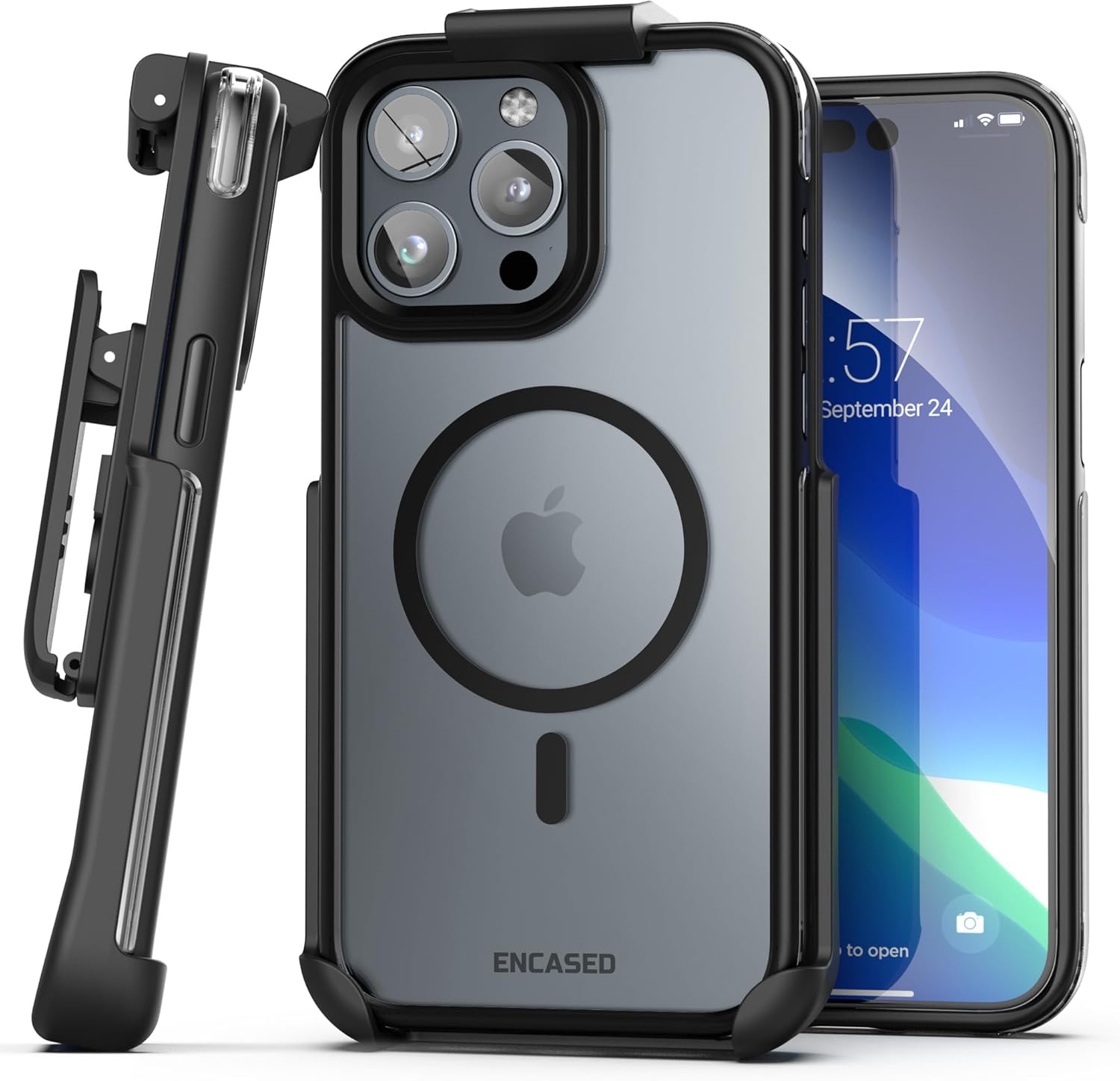 Encased MAG Case Designed for iPhone 15 Pro Belt Case with Holster Clip (Compatible with MagSafe) Black/Clear