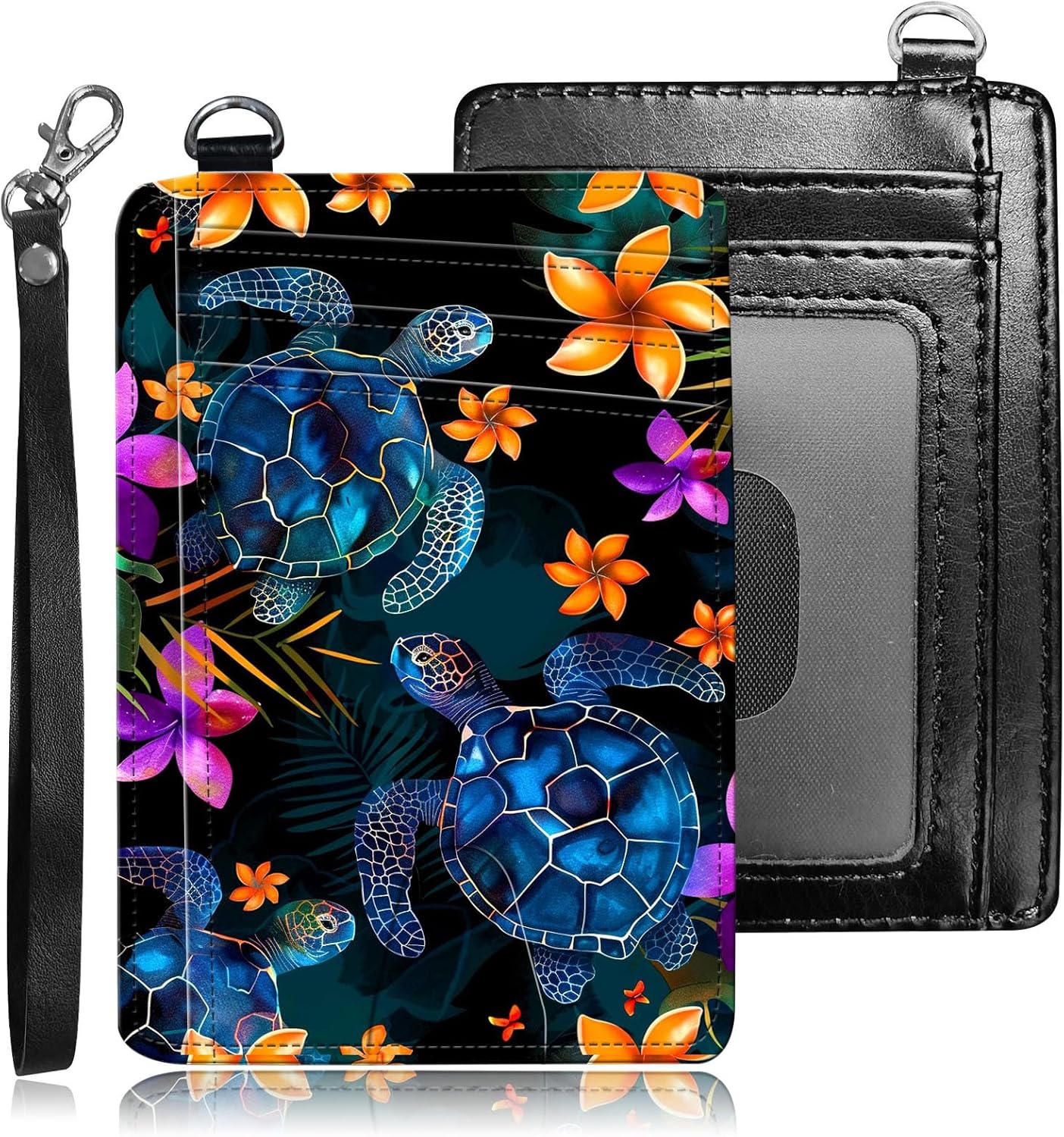 Credit Card Holder Slim Wallet,RFID Wallet Women Front Pocket Small Card Holder Travel Cute Thin Minimalist Card Case Leather Flat Wallet with ID Window&Wrist Strap,Glitter Sea Turtle