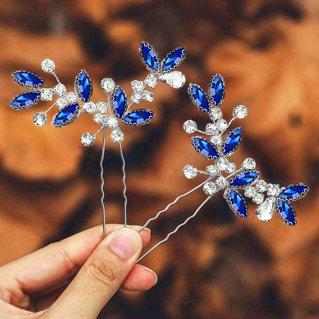 Casdre Crystal Bridal Hair Pins Rhinestone Bride Wedding Hair Piece Hair Accessories for Women and Girls (Pack of 2) (A Blue)
