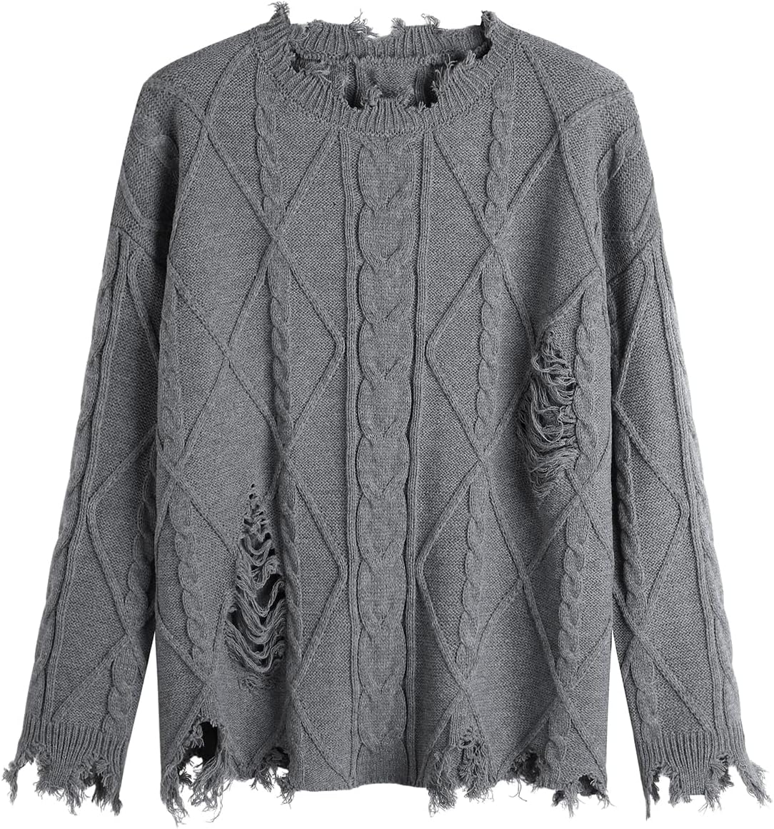 GABERLY Oversized Distressed Cable Knit Sweater Pullover with Frayed Edges Vintage Style Fall Winter Knitwear for Women