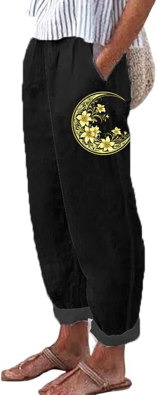 Womens Fashion 2024 Summer Casual Star Printed Palazzo Pants Loose Elastic Waist Cotton Trouser Flowy Leg Pants