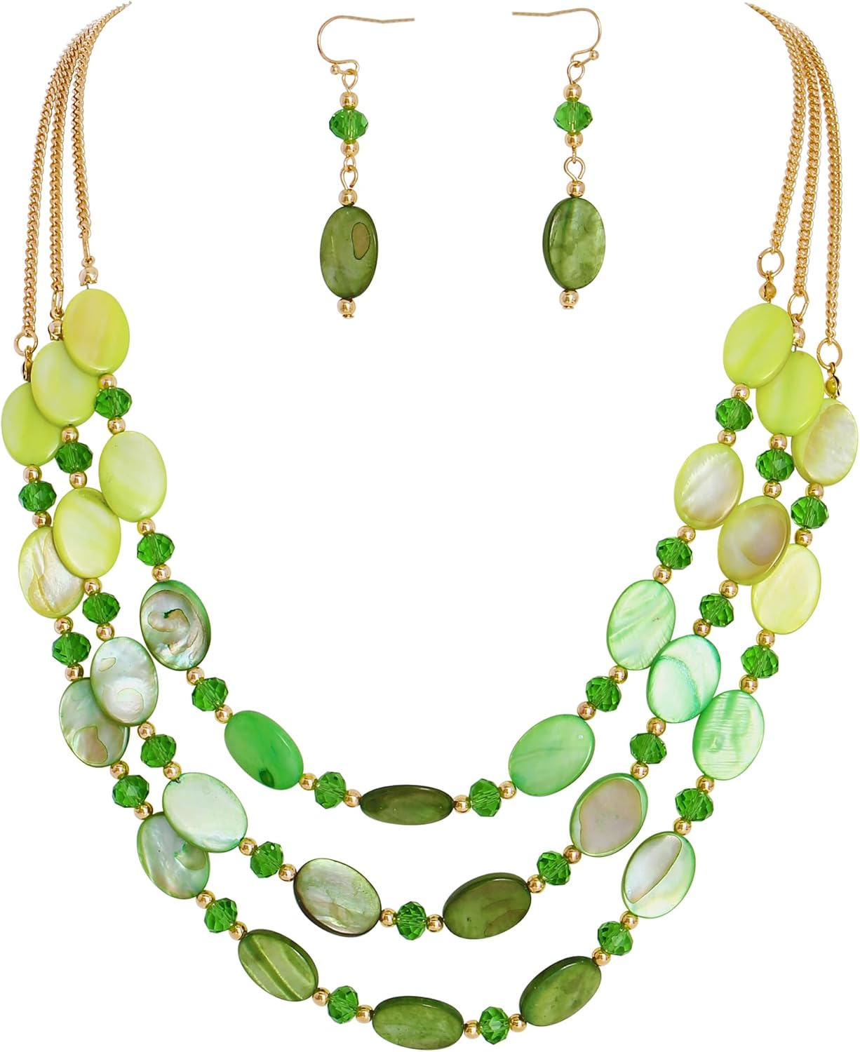 Firstmeet 3-Layer Mother of Pearl Beads Necklace with Earrings Oval Beads Pendant Jewelry for Women