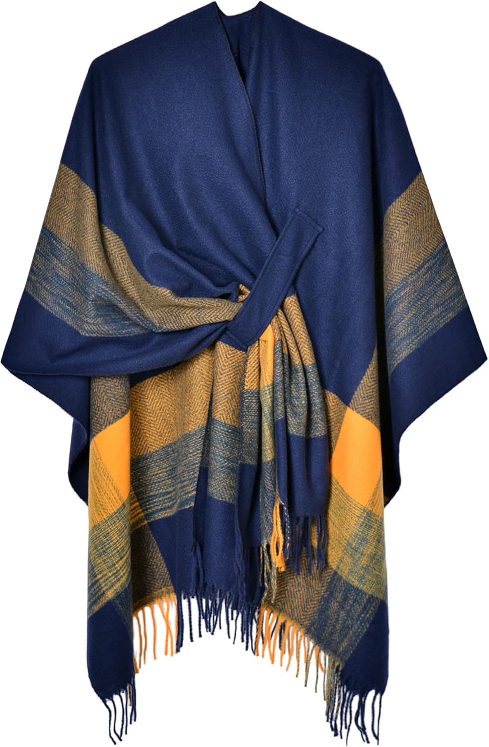 YnimioAOX Women's Poncho Shawl Wrap Soft Knit Cross Front Plaid Cape Cardigan with Tassels for Fall Winter