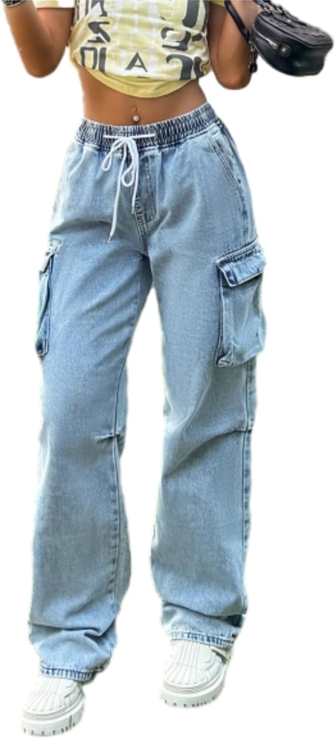 Cargo Jeans Women Elastic Waist Stretch Wide Leg Denim Pants Pockets Baggy y2k Streetwear Pants