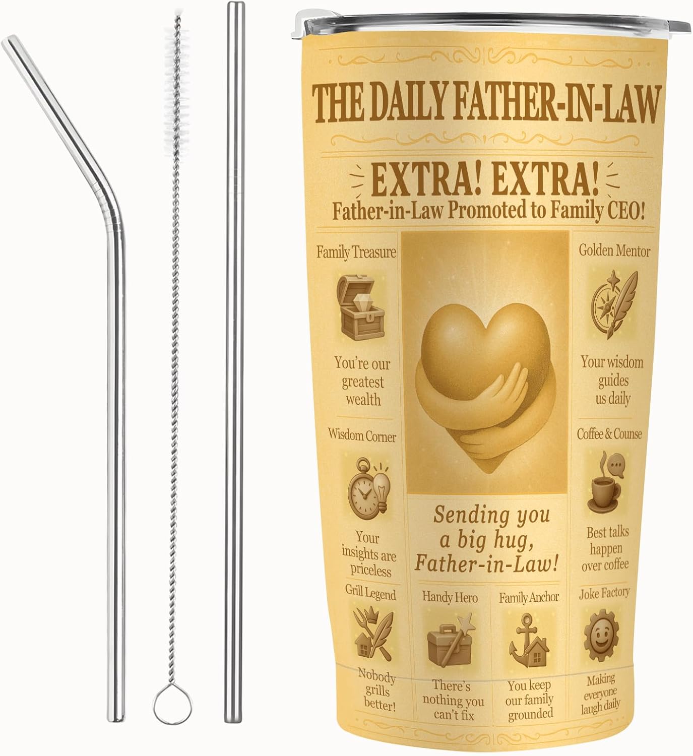 Father-in-Law Gifts 20oz Travel Tumbler, Vintage Newspaper Style, Best Ever Present for Birthday, Christmas & Fathers Day, Retro Coffee Cup