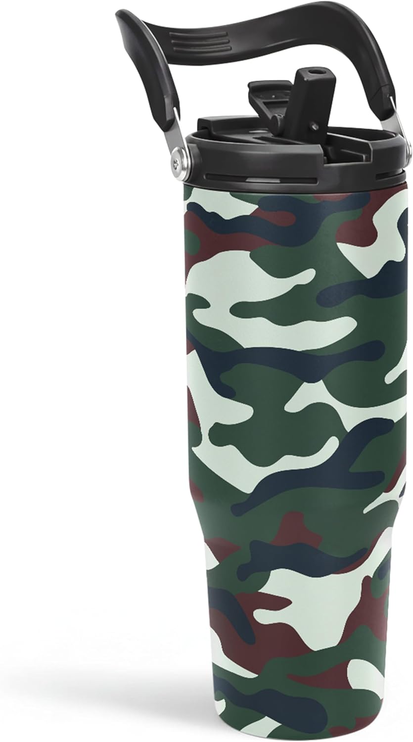 SANDJEST Camo Tumbler with Handle 30oz - Camouflage Tumblers Stainless Steel Insulated Flip Straw Coffee Travel Cup, Gifts for Men Veteran Hunting Lover Sport Outdoor Workout