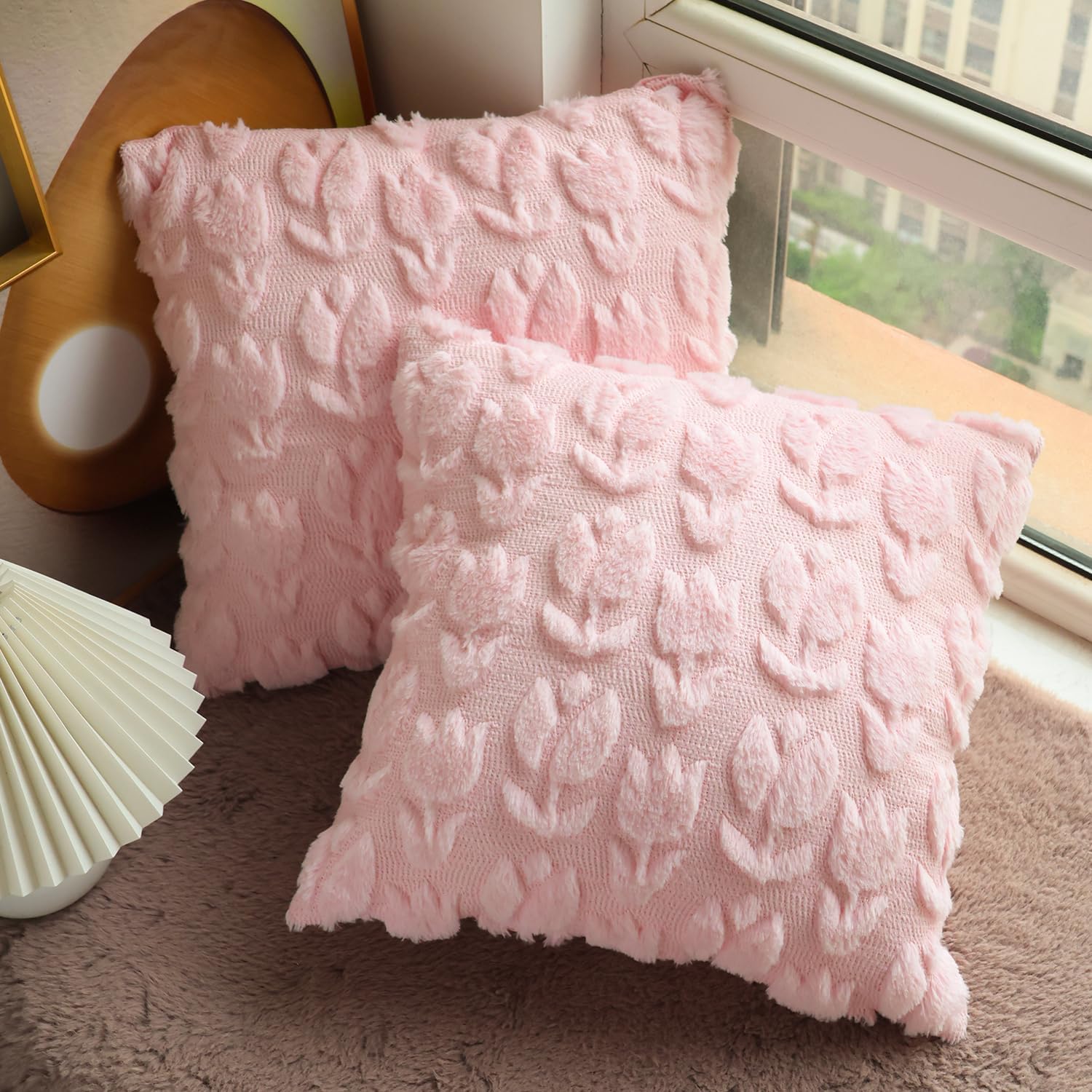 Tulip Embroidered Throw Pillow Covers 18 x 18 Inch Set of 2, Plush Jacquard Pillow Covers for Farmhouse Couch Sofa Bedroom Decor Pink