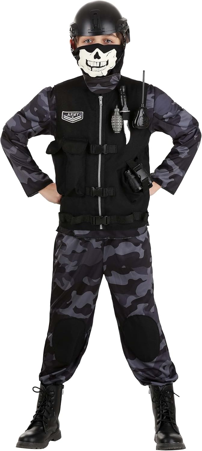 Kid's Elite Army Costume with Military Vest, Toy Helmet, and Accessories, Skull Mask Soldier Halloween Costume for Boys