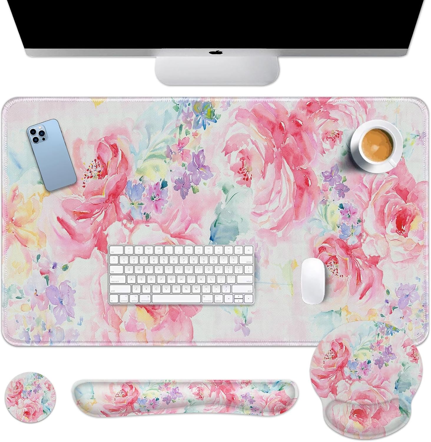 Arttown Flower Painting Desk Mat, Watercolor Abstract Mouse Pad Set 4-in-1 Large Mousepad+Keyboard Wrist Rest+Mouse Wrist Rest+Coaster with Ergonomic Design, Non-Slip Mat