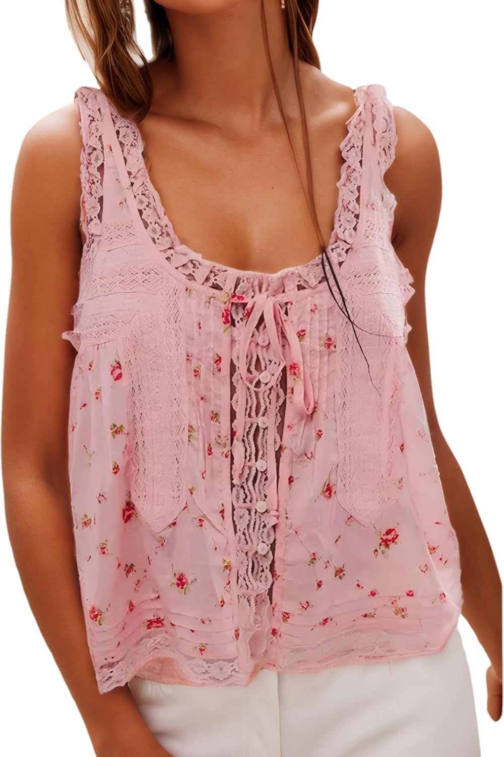 Women Summer Boho Lace Tie Front Tank Beach Vacation Top Button Down Sleeveless Cardigan Crop Y2k Tops Clothes