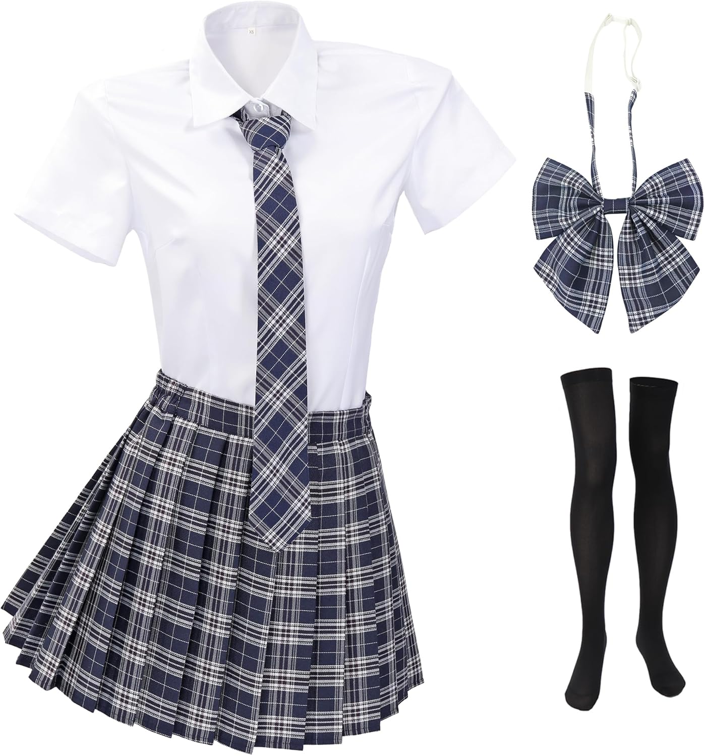 PROCOS Women Japanese Uniform Outfit US Size Costume with Plaid Bow Tie Socks 5 PCS