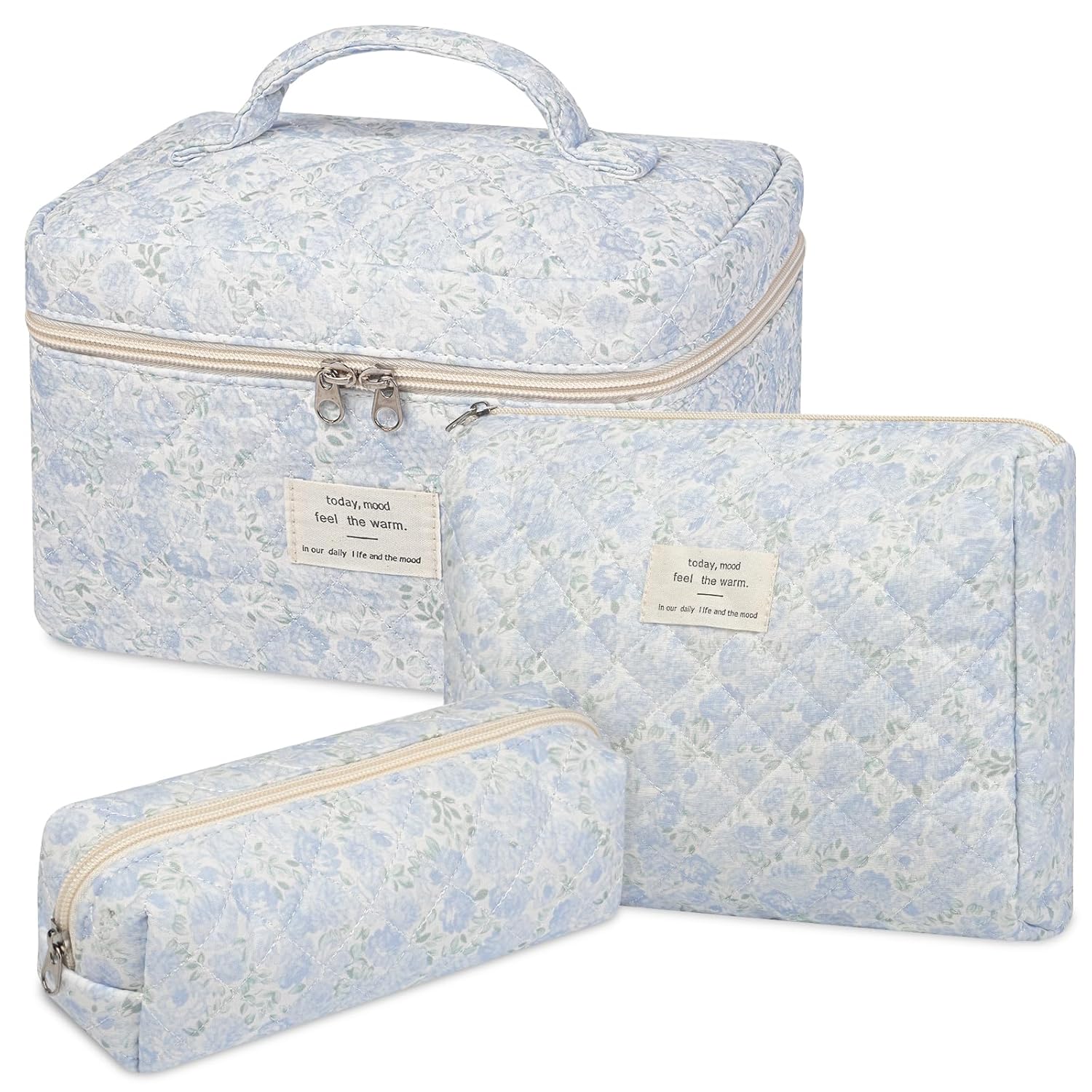 senbowe Floral Makeup Bag, 3 Pack Large Cotton Quilted Makeup Bag Set, Cute Floral Coquette Aesthetic Toiletry Bag Make Up Cosmetic Bag for Women, Toiletry Travel Make Up Organizer Bag