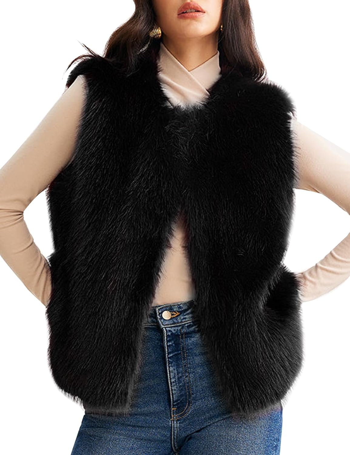 Flygo Faux Fur Vest Women Sleeveless Faux Fur Jacket Furry Open Front Cardigan Top Fluffy Winter Vest Outerwear