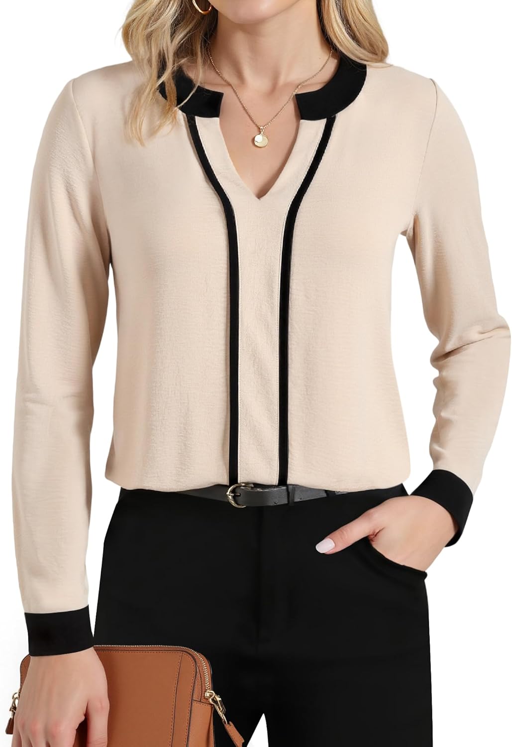 Business Casual Tops for Women - Long Sleeve V-Neck Color Block Shirt - Dressy Casual Work Blouse - Office Wear Trendy Style
